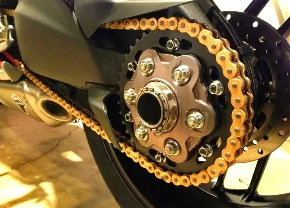 Серед схем передачі потужності багатьох мотоциклів система передачі ланцюга та зірочки стала кращим вибором для багатьох мотоциклів через прості та ефективні характеристики. Він має високу ефективність передачі та загальну легку вагу, особливо підходить для типів транспортних засобів, які потребують високого крутного моменту. Однак він також має певні обмеження, такі як зношування та шум під час роботи. Під час процесу передачі потужності двигуна на задні колеса можна досягти ампліфікації крутного моменту та коефіцієнта відновлення, регулюючи співвідношення зубів передніх та задніх передач.